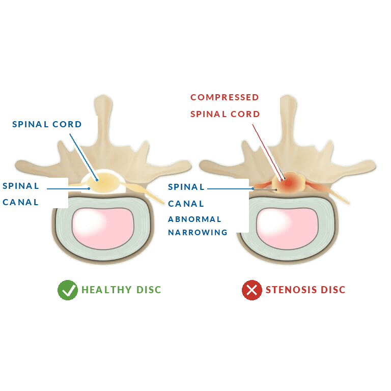 Spinal stenosis happens when the space inside the spinal canal becomes narrowed, which can place added pressure on the spinal cord or nearby nerves.